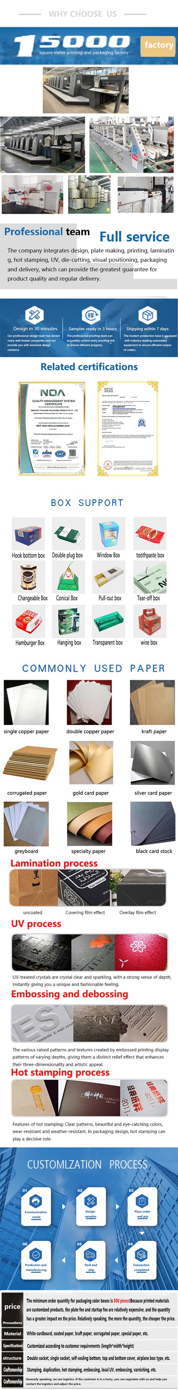 Price: The minimum order for packaging color boxes is 500! Because printed products are customized products, the plate fee and machine fee are relatively expensive, and the quantity has a greater impact on the price. Relatively speaking, the more quantity, the cheaper the unit price will be. All products in this store are marked with symbolic prices. For specific prices, please provide specifications, structure, paper, quantity, printing, and process consultation customer service! We will sincerely calculate the unit price for you!
