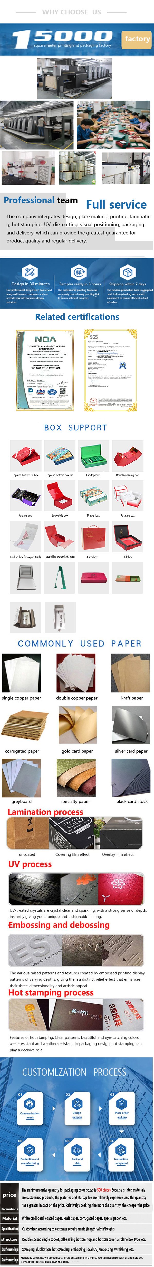 Price: The minimum order for packaging color boxes is 500! Because printed products are customized products, the plate fee and machine fee are relatively expensive, and the quantity has a greater impact on the price. Relatively speaking, the more quantity, the cheaper the unit price will be. All products in this store are marked with symbolic prices. For specific prices, please provide specifications, structure, paper, quantity, printing, and process consultation customer service! We will sincerely calculate the unit price for you!